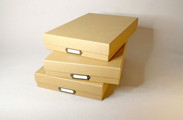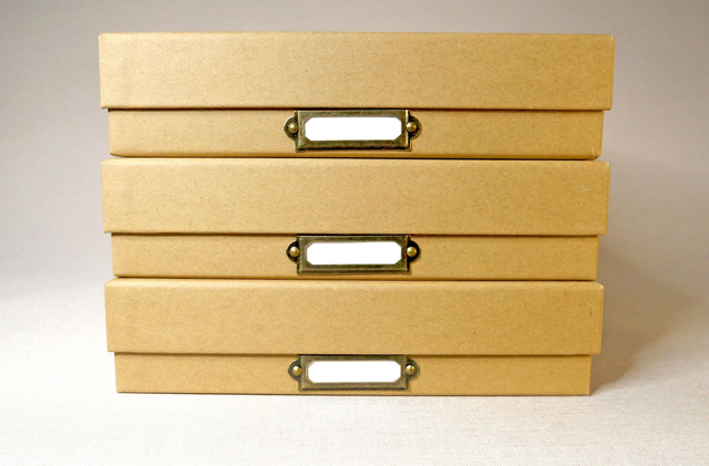 One end of the box features an antique brass style file label holder for 45mm x 16mm card label.